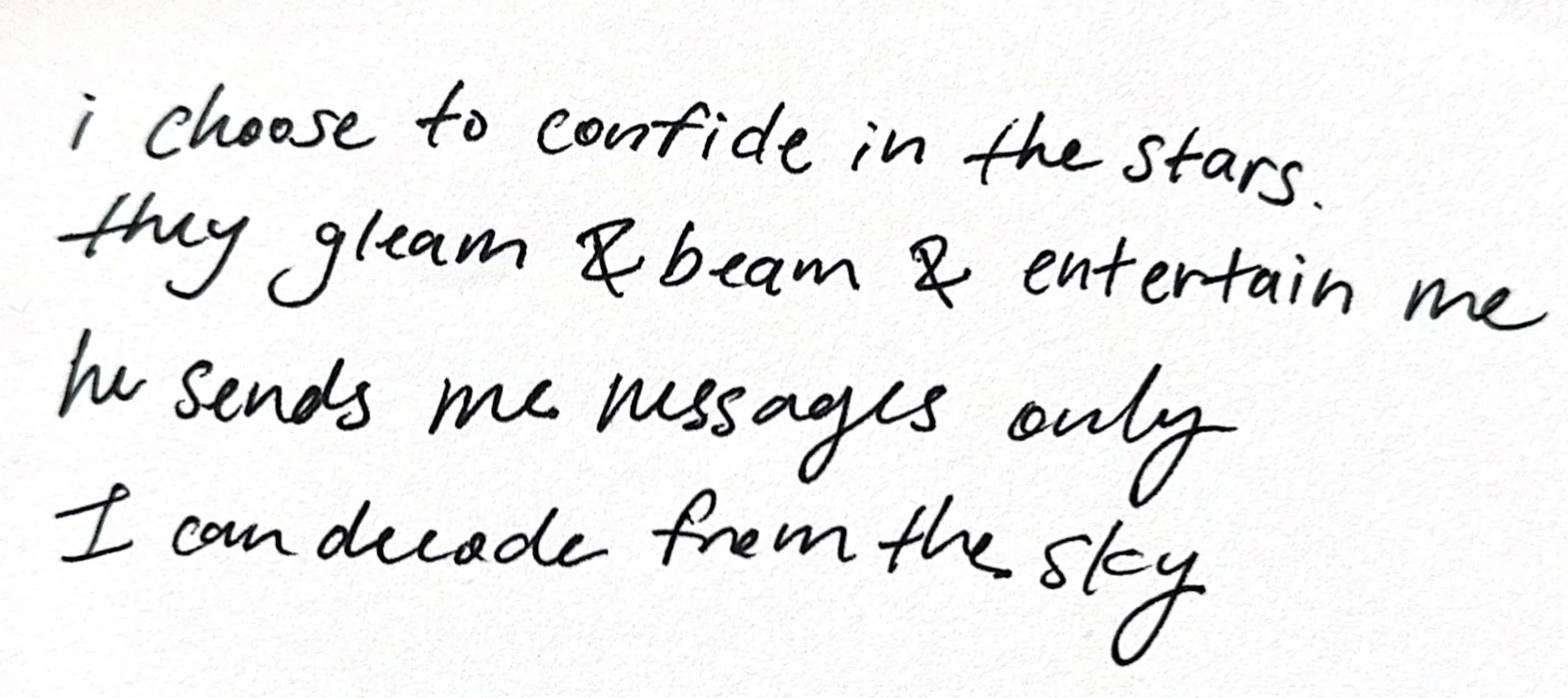 Over the course of five years, I have written these poems documenting how my relationships have shifted. Each family member correlates to a part of the solar system based on their relationship to me.